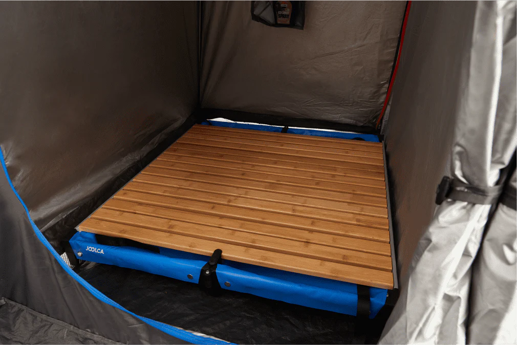 Compatible with all Joolca tents, the ENSUITE Shower Base lays proper bathroom flooring in seconds. It’s the real deal through and through. A sturdy extruded aluminium frame with glass-filled nylon elbows. A slanted capture tray in welded PVC. An elevated bamboo deck with marine-grade, UV-stabilised clear coat. Stainless steel fixtures. And efficient drain ports for leading water away from the campsite or recirculating back to your HOTTAP.