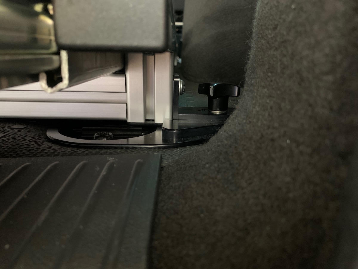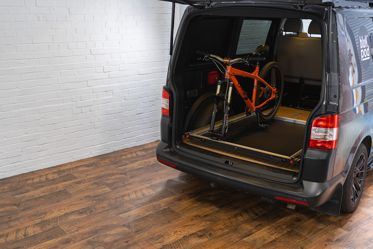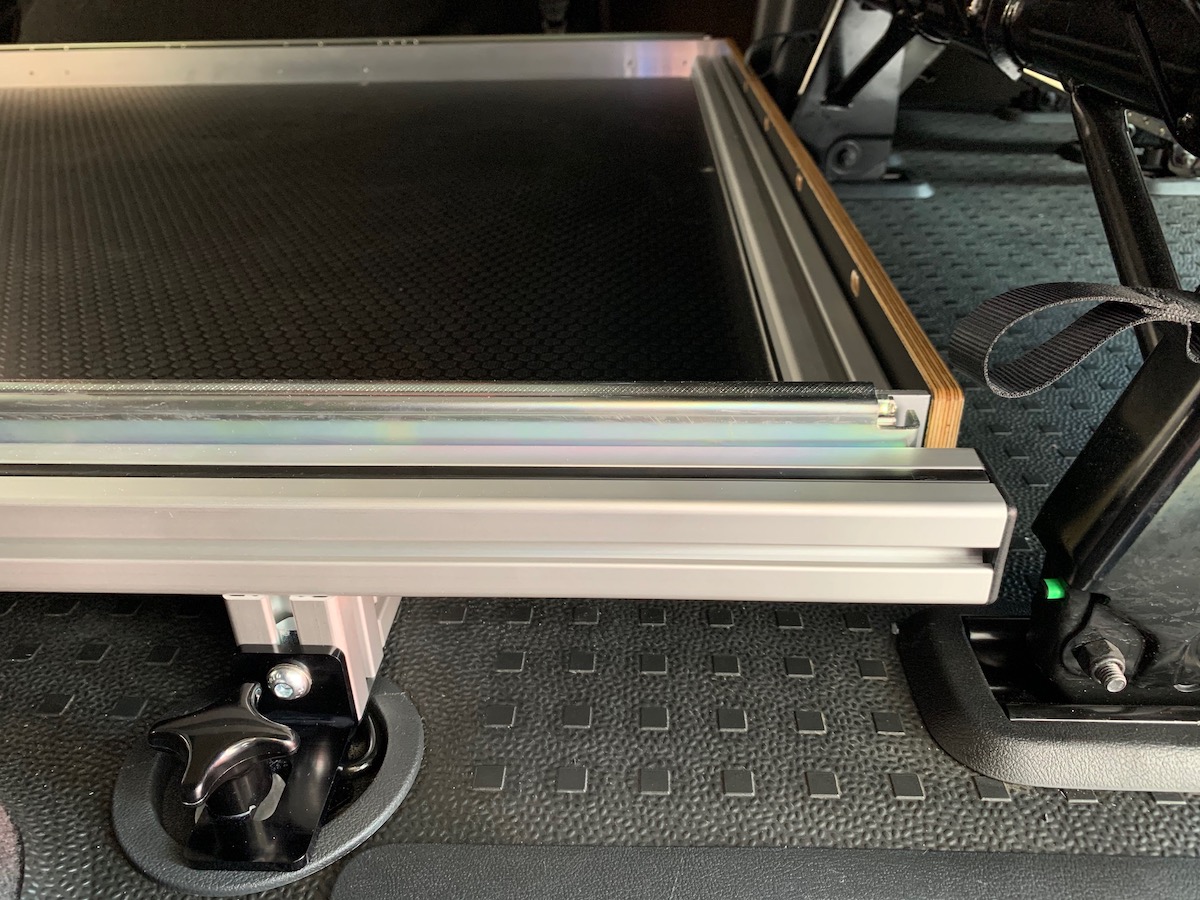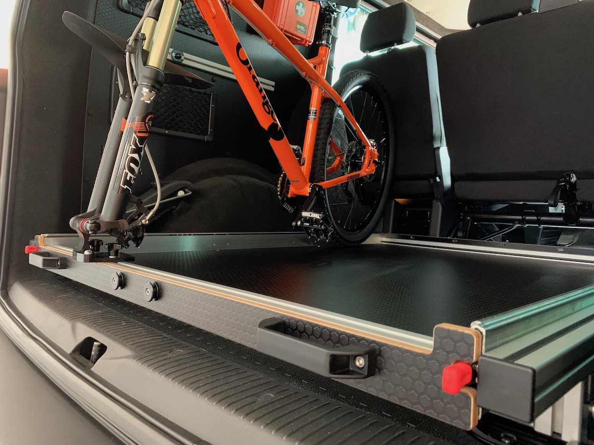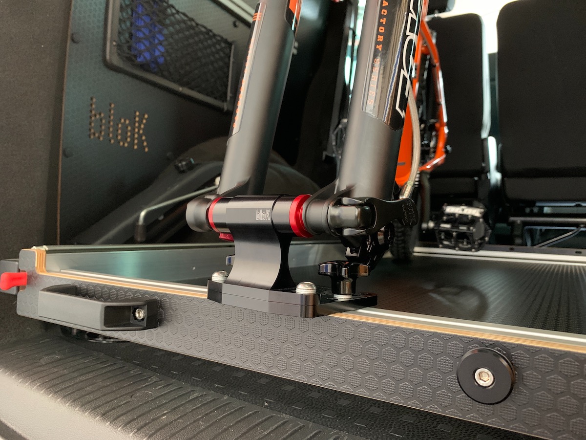 The main base and facias of the tray are constructed using 12mm Birch Ply that has been resin coated with a printed hex pattern, this stuff is waterproof, super strong and virtually impossible to scratch so will last for years. At the front, rear and both sides of the tray there is a aluminium profile rail to allow for connecting some of the accessories we make, after all what good is a tray if you can’t mount stuff to it.  Add one of our Fork mounts suitable for extrusion fitting with the correct fork mount and axle inserts and you have everything you need to mount your first steed.  There really easy to mount – The t-nuts (supplied with the Extrusion fitting Fork Mounts) just slip in from above so you don’t need to worry about taking the frame apart. Fork Mount/ Mounts just drop on, finger knobs located in the t-nuts and positioned/ re positioned before tightening.