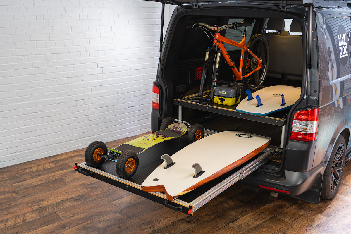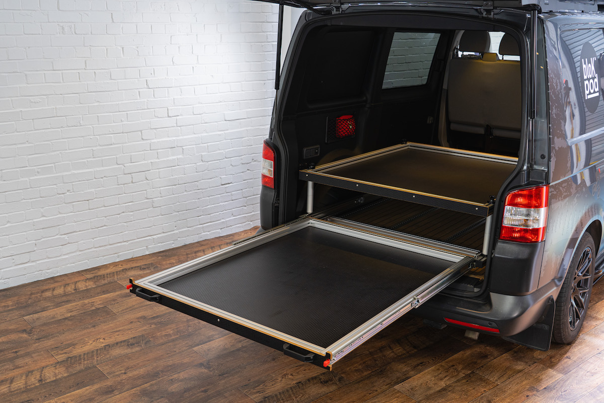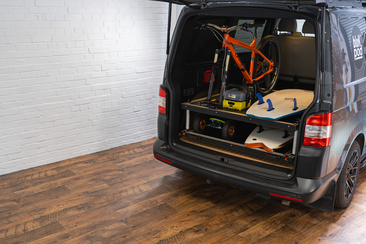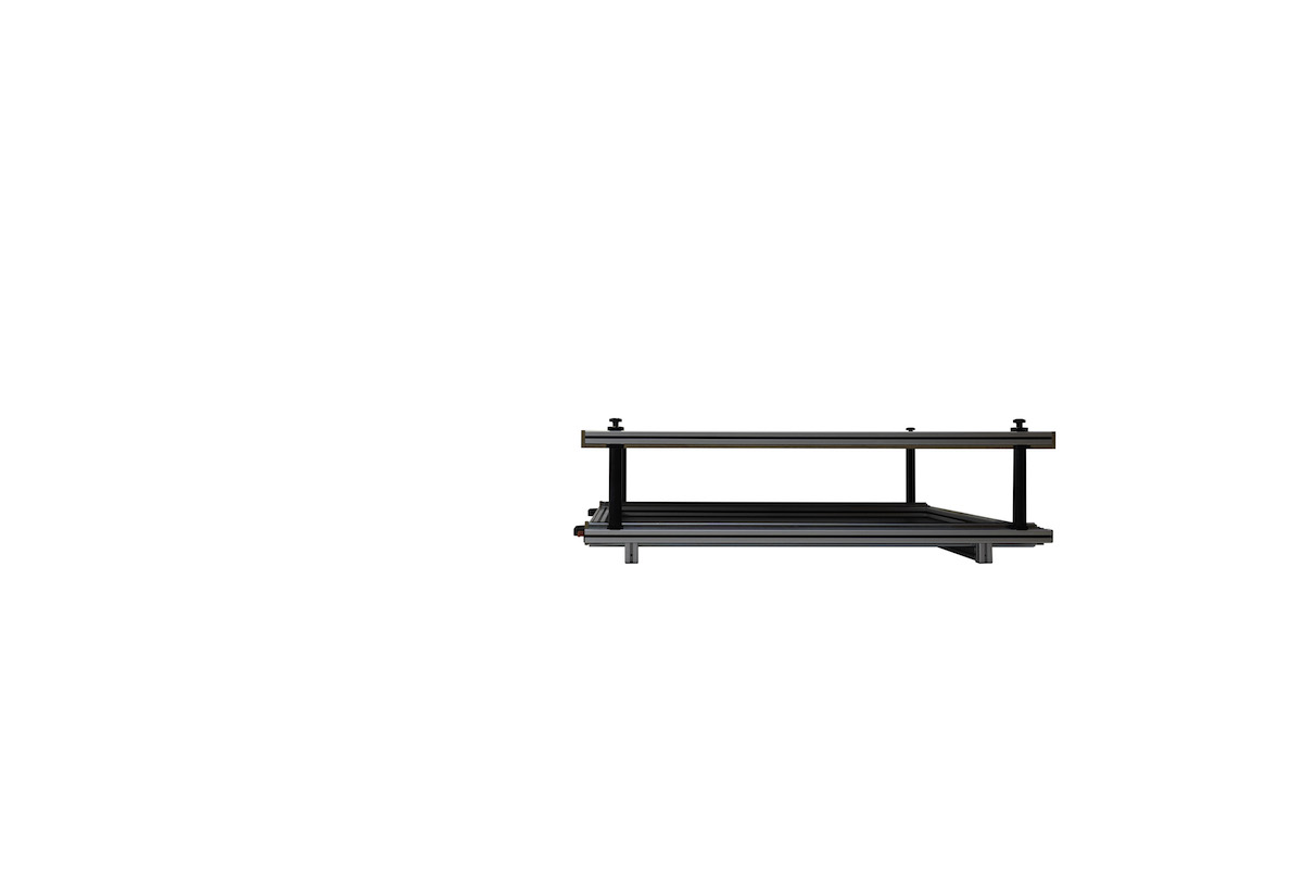 This ones a bit different, a sliding tray on the bottom for all your bits with a second level fixed platform, the second level functions exactly the same as the sliding tray without the sliding bit 😉 it just gives you the double decker without the extra cost. The top platform is connected to the base tray with our quick release system, the base tray has 4 x tapered location mounts which then have spacer posts attached with screw threads, the tray then locates onto the posts via the Male/Female tapered joints, then tightened with 4 x finger knobs. We supply spacers with just the right amount of height to get euro boxes on the base tray and enough clearance on the second level for the largest of bikes. If you need more space below then additional spacers can be purchased and added to what you have.