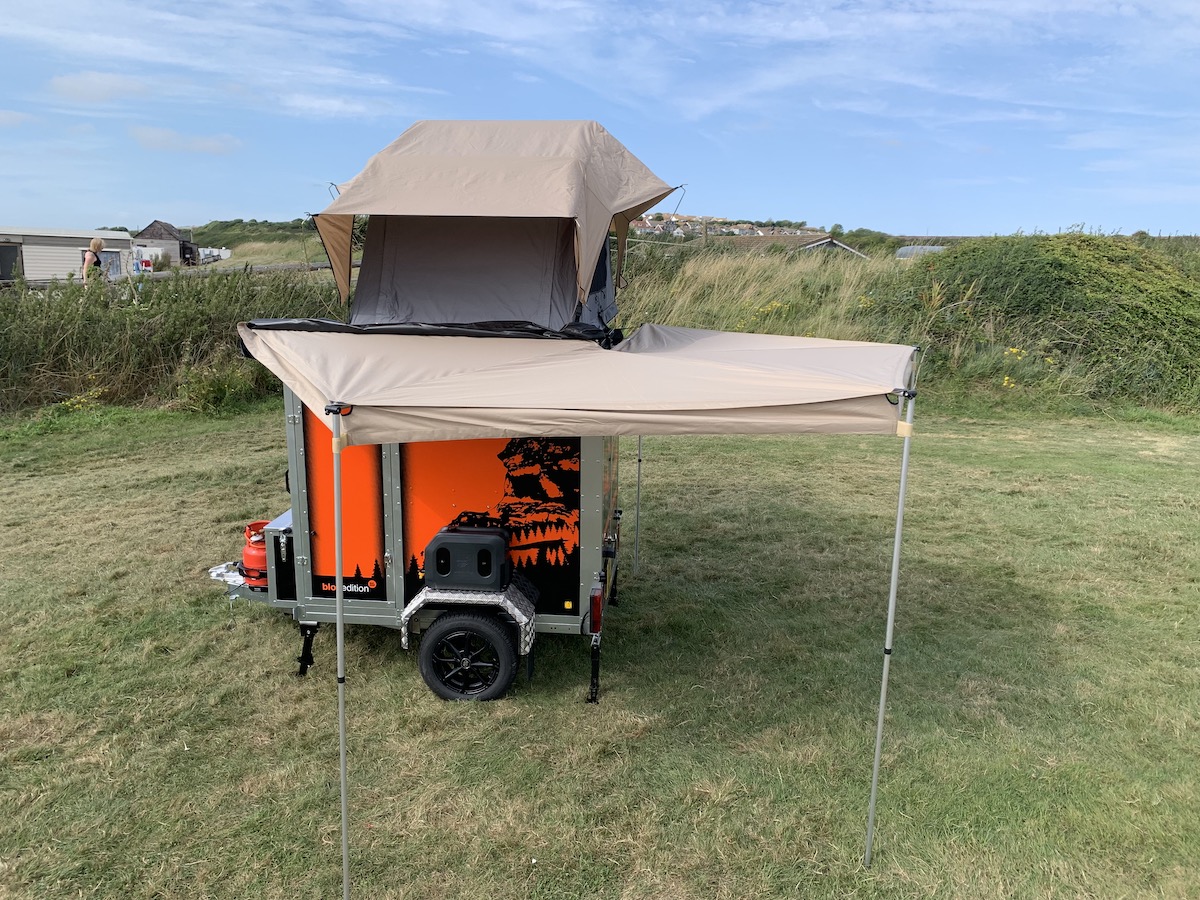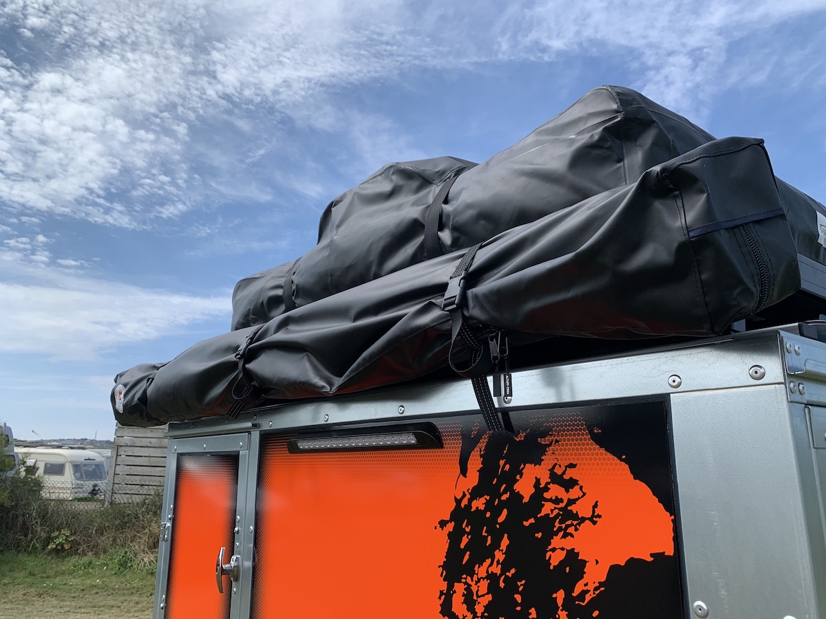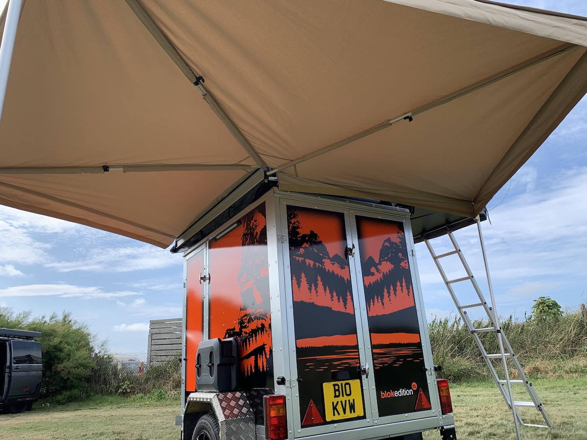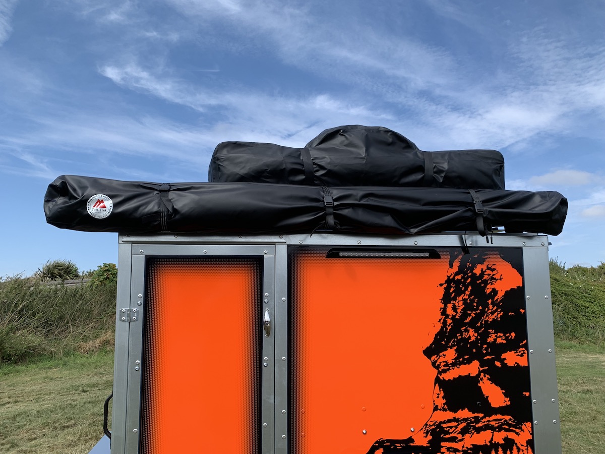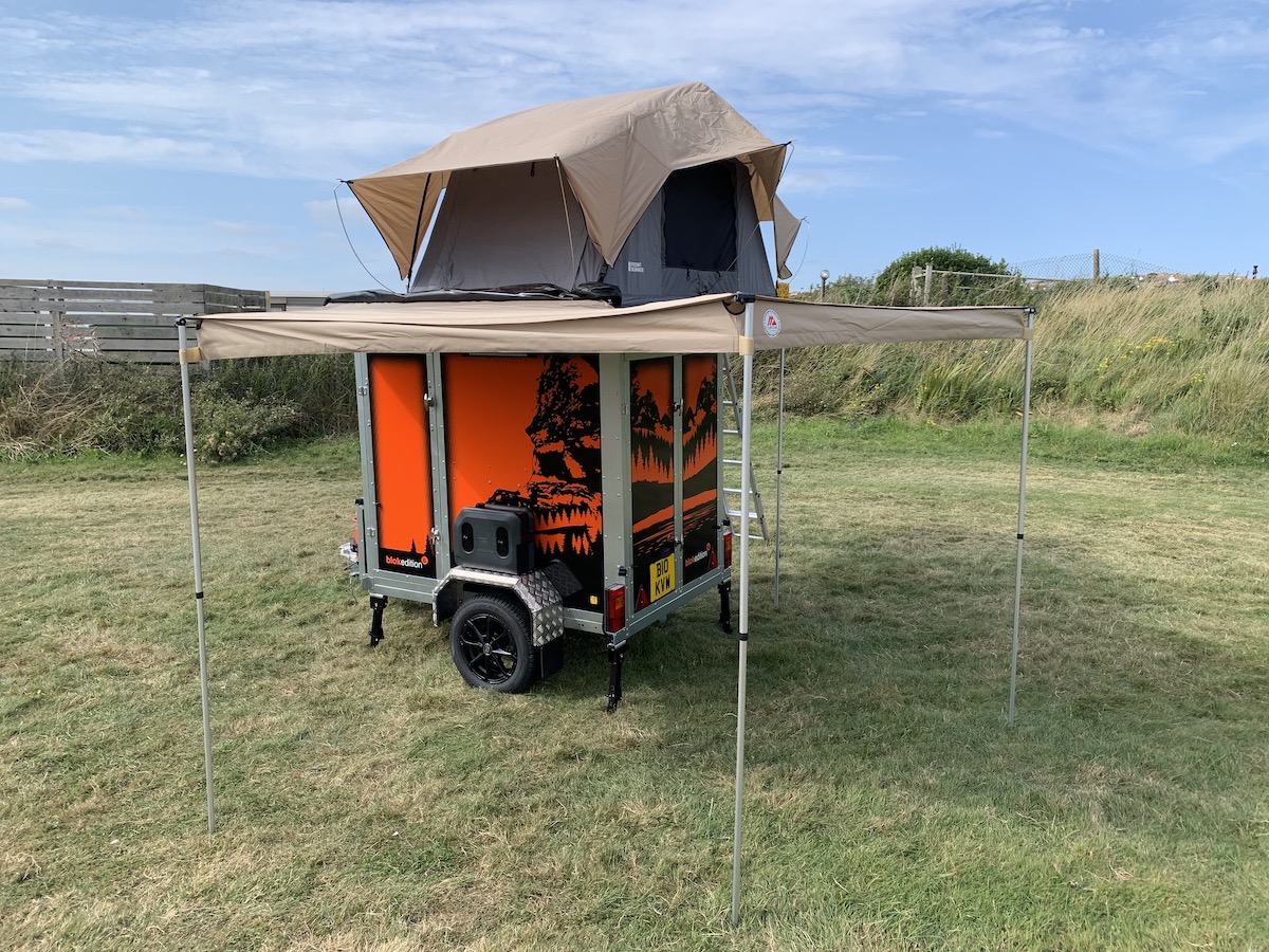 Opens out from the side of your Trailer and swings around the side to the back, offering a huge covered 270 degree area of cover.