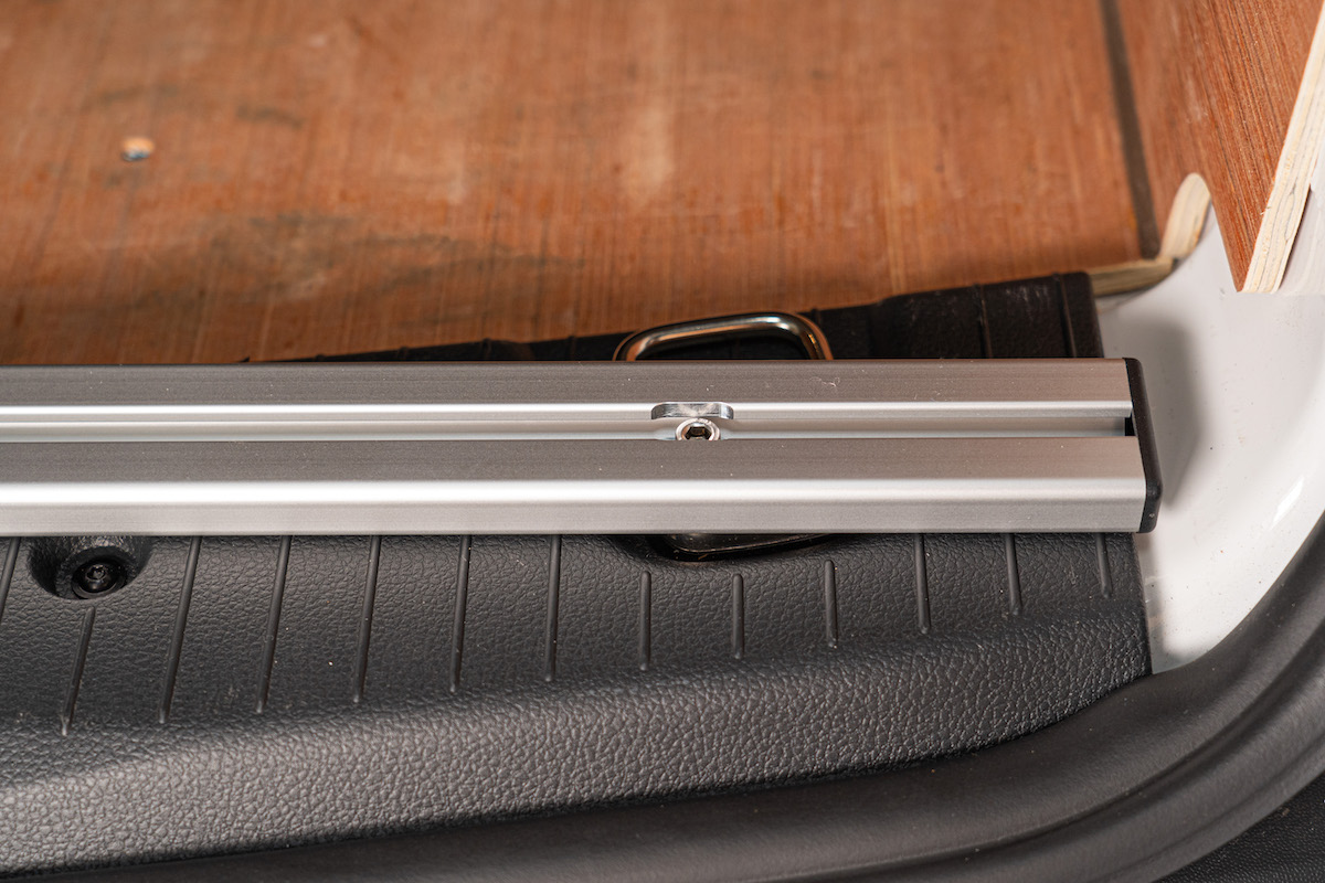 We supply a piece of 40mm wide x 16mm high x 1160mm long extrusion that has a single t-nut slot and 2 x end caps. There are 2 x recessed slots machined at each end to allow for 1 x M6 fixing to be added to the vehicles factory fitted fixing holes (Rear Cargo Hoops), we also supply 2 x spacers to fit between the existing cargo hoop fixing holes and the underside of the rail so you don’t crush the rear threshold.